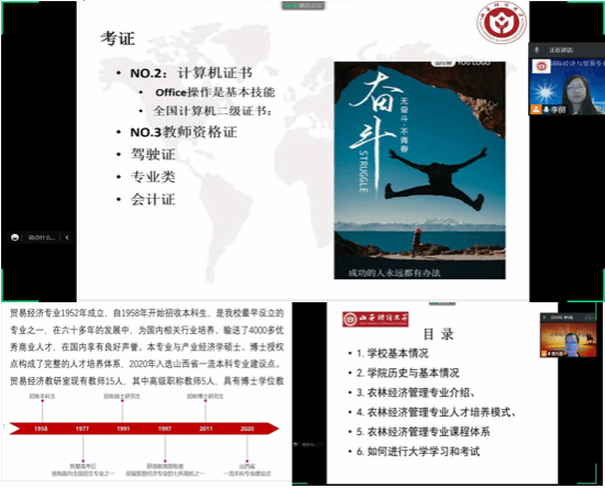 第二阶段是专业教育。国际经济与贸易教研室主任李丽老师、贸易经济教研室主任杨兴夏老师、国际商务教研室主任刘青云老师和农林经济管理教研室主任曹先磊老师向新生简要介绍太阳概况和教研室概况后,分别重点就不同专业的专业发展历史和发展前景、人才培养模式和培养目标、专业课程体系等进行专业教育。通过专业教育,让新生同学了解本专业的发展历史和特色、围绕培养目标塑造自身素质能力、全面规划课程学习计划,帮助新生获得学习生活的价值。